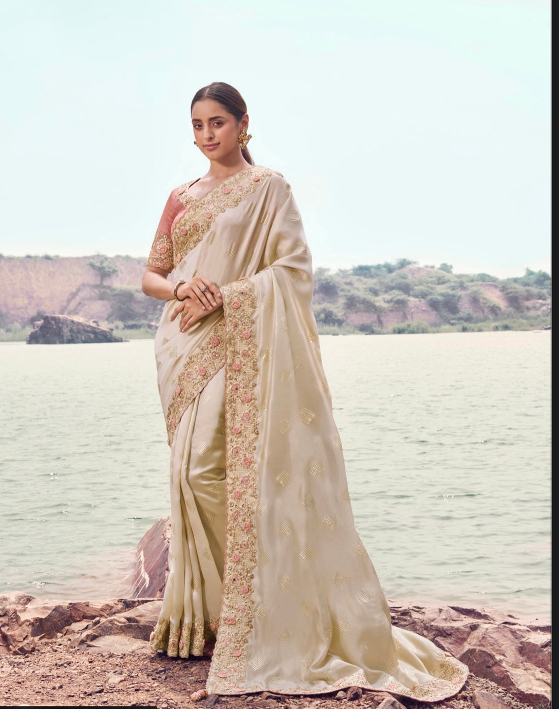 This exquisite saree embodies timeless elegance, featuring intricate embroidery and delicate sequin work that shimmers...